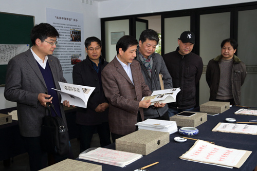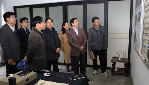 王继岗一行先后参观了专业录播教室、海外学堂展厅、书法临摹室、学生教室,听取了外事处处长冯燕、兰亭书法艺术学院副院长沈伟等关于近年来书法“国际化”的推广及书法海外学堂建设情况的汇报。
