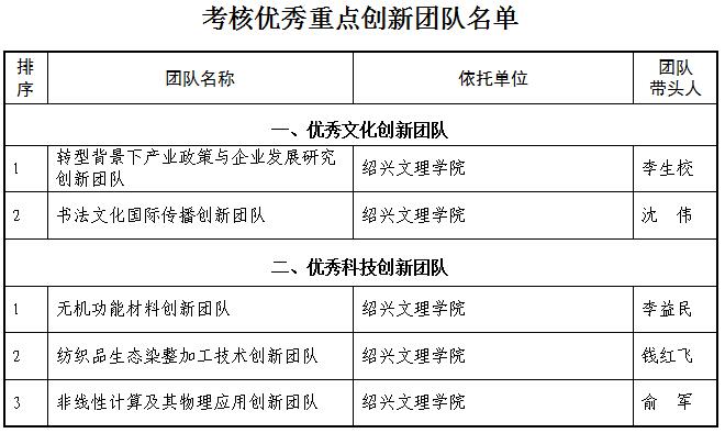1月6日,绍兴市委人才工作领导小组下发《关于公布第四批绍兴市重点创新团队和考核优秀重点创新团队的通知》(绍市委人领〔2017〕2号)文件,我校15个团队通过评审成为第四批“绍兴市重点创新团队”,其中5个文化创新团队、10个科技创新团队。另外,5个创新团队被确定为“考核优秀重点创新团队”。详情如下: