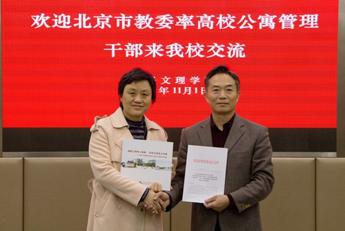 11月1日,北京市教委后勤处副处长李异军率中国人民大学、北京交通大学、华北电力大学等12所高校的学生公寓管理干部一行14人,来校考察交流公寓管理方面的先进经验。我校党委副书记唐和祥,阳明书院、保卫处、学工部、教师教育学院等负责人参加座谈。