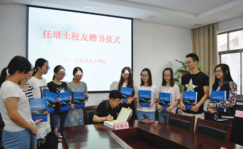 赠书仪式结束后,任培土校友为学弟学妹签名赠书,并合影留念。
