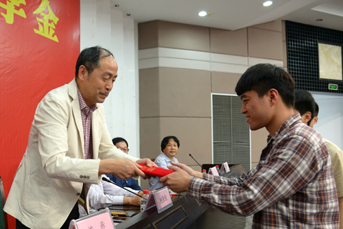沈赤在讲话中向长期出资出力关心学校建设发展的鲍贤伦校友、王震校友表示崇高的敬意和衷心的感谢!向获得2016年兰亭奖学金的各位同学表示热烈的祝贺!他指出,兰亭奖学金来自滕伟石书法教育基金。自滕校长成立书法教育组织、开创书法教育以来,一代代文理人薪火相传,脚踏实地,坚守创业,书法教育从书法教研组发展成了兰亭书法艺术学院,获得了国家教学成果二等奖,“兰亭书法学堂”走出了国门。在兰亭奖学金的激励和引领下,先后有21 名同学考取中国人民大学、天津美术学院等高校的硕士研究生,97人次在省级展览入展、获奖,8人次在全国展览入展、获奖。他希望获奖同学能常怀感恩之情,努力以自己的实际行动和优异成绩回报鲍贤伦、王震校友以及老师、父母的期待;希望全体同学把奖学金作为一种鞭策,使学习的全过程转变成一个努力进取、追求卓越的过程;希望书法艺术学院要立足实际、加强研究、规范管理,评好奖项,注重过程,运好结果,让兰亭奖学金能够成为引领学生立志成才、追求卓越的一个重要载体。