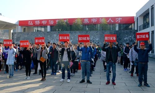 3月3日上午,我校2016年书法学(师范)专业考试开考。来自浙江、江苏、江西、陕西、黑龙江等14个省975名考生聚集在兰亭书法艺术学院“晋唐心印”照壁前,准备进入考场。