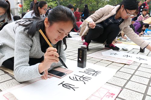 阳明书院的学生们在抑扬顿挫的古乐中提笔、着墨,书写出“格物致知 知行合一”、“上善若水”等作品。刚正不阿如楷,潇洒飘逸似行,一幅幅精彩绝伦的书法作品呈现在大家的眼前,既展现出阳明书院学生的才华横溢,也为在场的师生献上了一场视听盛宴。