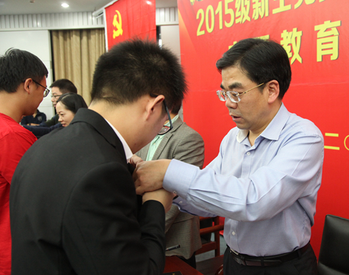 在庄严的《国际歌》中,与会领导为新生党员代表佩戴党员徽章并赠送了《习近平总书记系列重要讲话读本》、《世界大格局,中国有态度》和《苦难辉煌》等3本学习书籍。随后,全场所有党员面向党旗,高举右拳,进行了宣誓,重温入党誓词。来自土木工程学院的2015级硕士研究生赵灿同学和来自法学院思政121班的陈佳颖同学分别作为新、老生党员代表上台发言,陈佳颖结合大学成长经历,谈了自己对共产党员身份的理解和感悟,道出了共产党员应有的责任和担当;赵灿同学则从适应崭新大学和研究生生涯角度出发,在党旗下作出了投身党的事业的决心、勇气和承诺。