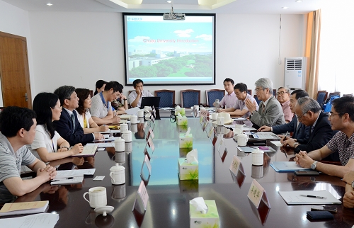 6月12日上午,日本中部大学学监、地域·国际连协教育研究中心长松尾直规,法人学监渡边诚、地域·国际连协教育研究中心中国合作推进部顾问阿部正广和前中国驻日本长崎总领事、中部大学客座教授曾文彬等一行前来我校交流访问。校党委书记周达军, 外事处、机械与电气工程学院、医学院、研究生学院、生命科学学院、外国语学院等相关负责人参加了合作座谈会。座谈会后,代表团一行还参观了兰亭书法艺术学院。