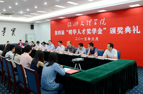 6月9日上午,校第四届“明华人才奖学金”颁奖典礼暨学生座谈会在铁城科教馆一楼会议室举行。校长叶飞帆、校党委副书记唐和祥,学工部、人文学院、法学院、医学院、经济与管理学院、兰亭书法艺术学院、元培学院负责人,全体获奖学生和优秀学生代表等参加了颁奖典礼。唐和祥副书记主持典礼。