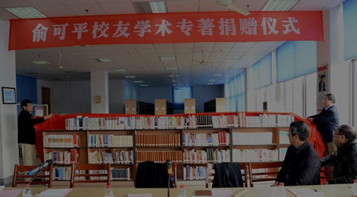 叶飞帆校长和俞可平校友一起为捐赠书籍专栏揭幕。同时,叶校长向俞可平校友颁发了捐赠证书。