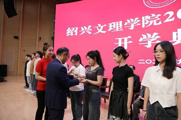 赵阳为新生代表佩戴校徽