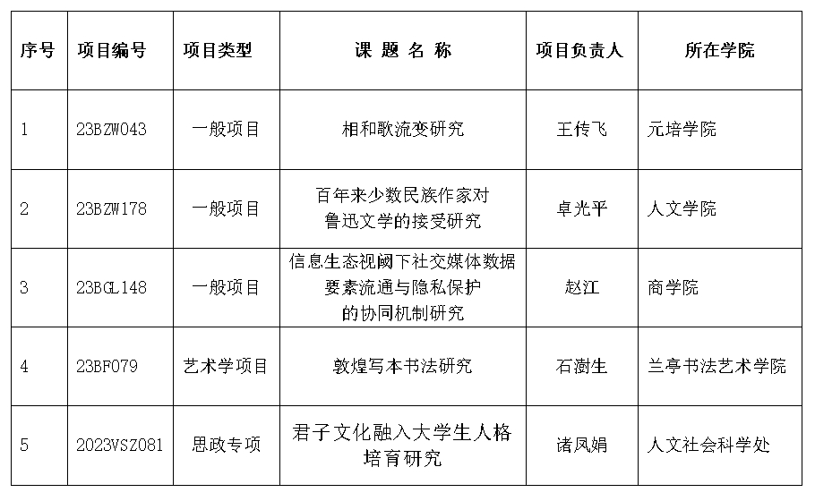 2023年度,我校获批国家社科基金项目共计5项,其中一般项目3项、艺术学项目1项、思政专项1项,高校思想政治理论课研究专项为首次立项,具体名单如下: