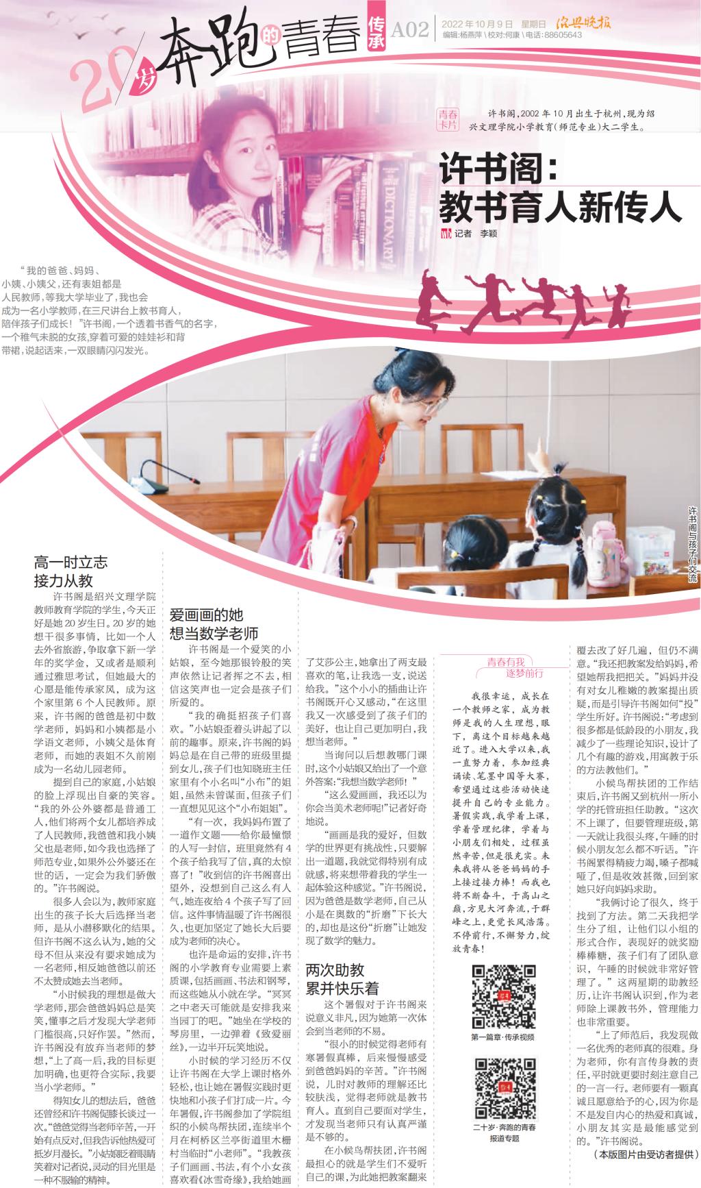 我很幸运,成长在一个教师之家,成为教师是我的人生理想,眼下,离这个目标越来越近了。进入大学以来,我一直努力着,参加经典诵读、笔墨中国等大赛,希望通过这些活动快速提升自己的专业能力。暑假实践,我学着上课,学着管理纪律,学着与小朋友们相处,过程虽然辛苦,但是很充实。未来我将从爸爸妈妈的手上接过接力棒!而我也将不断奋斗,于高山之巅,方见大河奔流,于群峰之上,更觉长风浩荡。不停前行,不懈努力,绽放青春!(记者:李颖)