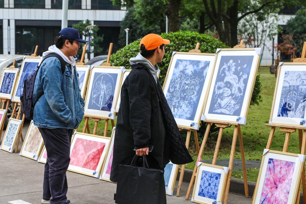 “非遗传承与创意设计实践体验”活动中,现场扎染DIY体验区吸引了许多师生的参与。纺织服装学院2009届校友叶科现场教学指导。叶科作为青年手作人,毕业后返乡创立松阳云缬文化创意有限公司,投身传统手工染、织、绣、绘产品的设计制作,带动当地及周边村民20余人从事染材种植、手工制作、产品包装等领域创业。2018年10月,他受孔子学院总部(国家汉办)邀请,作为乡村振兴代表,参加在德国法兰克福举行的中外文化交流活动,现场展示茶扎染。2020年10月,浙江省委主要领导在丽水松阳考察时莅临云缬坊,对染织非遗的传承工作给予充分肯定。另外,据悉,活动扎染织物为义卖品,义卖所得收入将全部捐入学院爱心公益平台“壹诺基金会”。“活动很有意义,不仅可以欣赏到优秀作品,动手体验,还可以献一份爱心,一举多得。”轻化工程181班学生李瑞鹏说。