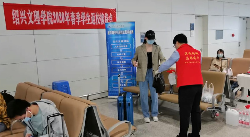 “同学你好,是我们文理学院的学生吗?请来这里。”“同学,请先保管好随身物品和重要证件。”“请大家排队扫码上车,注意保持距离,行李我们会帮你们搬上去的。”每天,来自各二级学院和机关党委的教职工志愿者戴上口罩,穿着红马甲,24小时轮流值岗,服务在萧山国际机场、绍兴高铁北站、绍兴火车站、客运中心、汽车西站、上虞东站等公共交通站点。