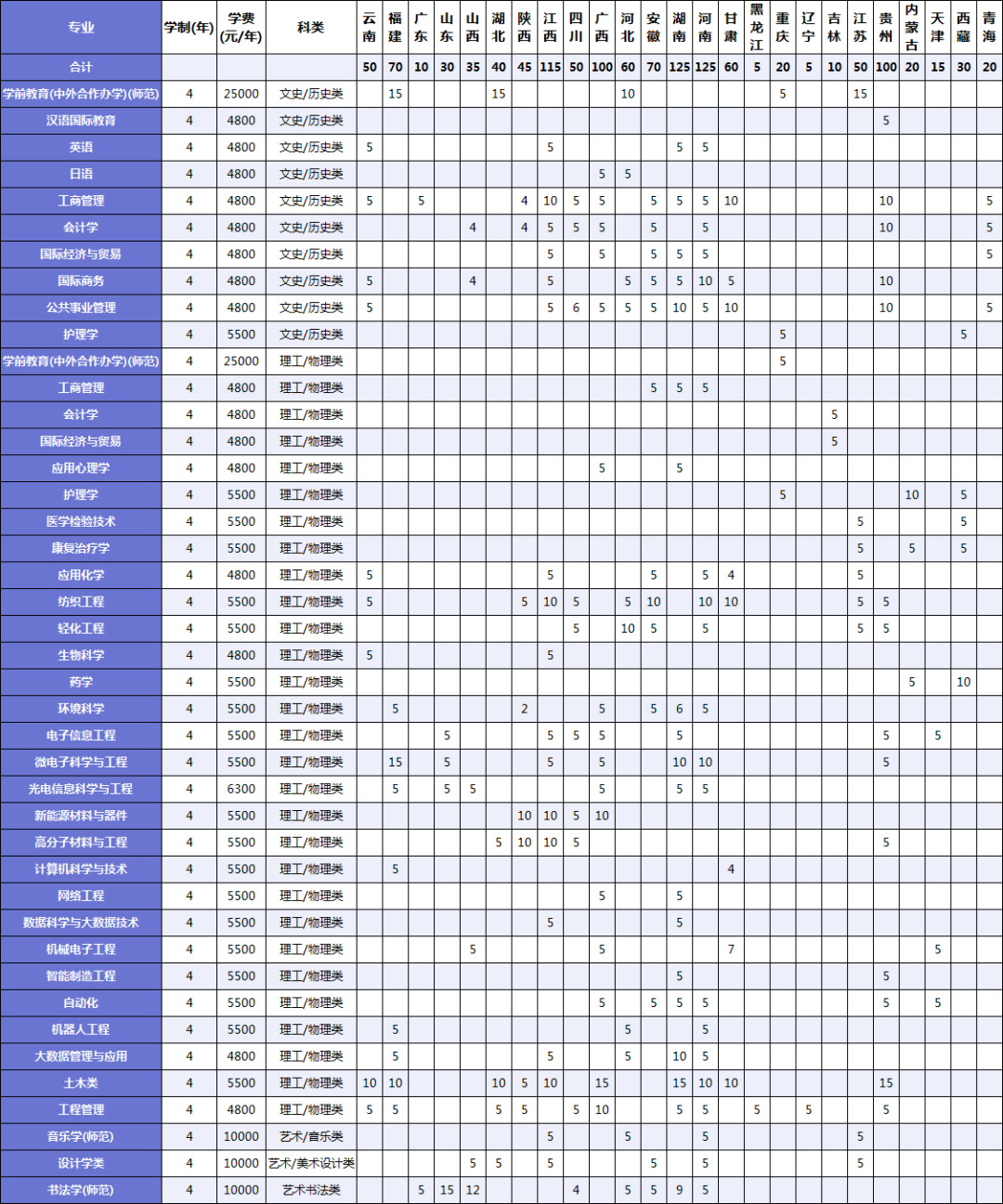 面向省外25个省计划招生1260人,其中湖南、河南、江西、广西、贵州等5省招生计划均达100人以上。另有少数民族预科转入15人。