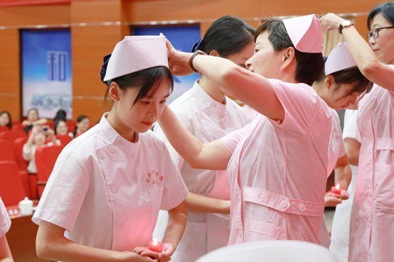 在授帽仪式上,最美护士代表滕斯斯、裘万民为学生点燃象征着南丁格尔精神的红色蜡烛,依次传灯,传承护理精神。五位护理前辈和十佳护士长为现场所有学生代表授帽,氛围格外庄严而神圣。