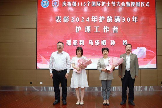 与会领导分别为护龄满30年护理工作者送花,为十佳护士长、十佳护理组长、最美护士、2024年护理技能竞赛获奖人员、以及“互联网+护理服务”先进个人颁奖。同时,医学院和附属医院领导为第十八届护理知识竞赛获奖学生颁奖。