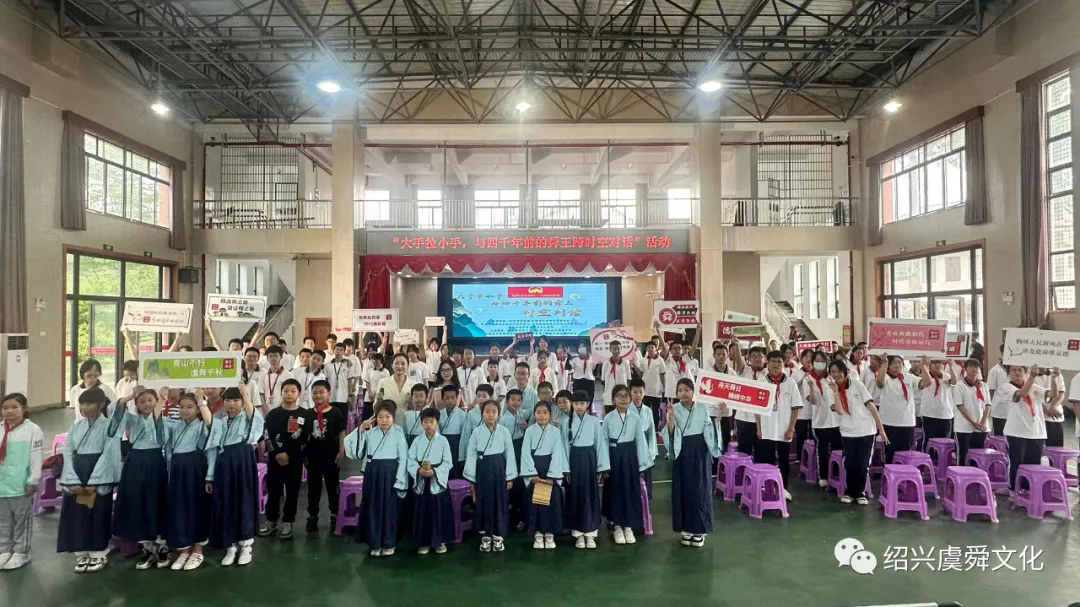 第三篇章是大手拉小手,一起对话典籍里的舜王。大手拉小手,时空穿梭之旅还在继续,大学生主讲人冯煊如带领中小学生,“穿越时空”共同对话典籍里的舜王。第一站来到两千年前春秋战国时期,与孔子的弟子一起学习《尚书·舜典》,小学生们在大学生主讲人的带领下饱含感情地诵读《舜典》,从孔子解读中了解舜王。第二站来到了西汉时期,大中小学生共同探讨司马迁对“天下明德皆自虞帝始”的评价。第三站是跟着时任会稽府签判(相当于法院院长职务)王十朋,深入民间考察风土人情,了解虞舜精神如何熏陶着千年前的绍兴人。第四站是穿越到伟人毛泽东作诗创作的“六亿神州尽舜尧” 小手”一起了解历代对虞舜精神的歌颂与传承。