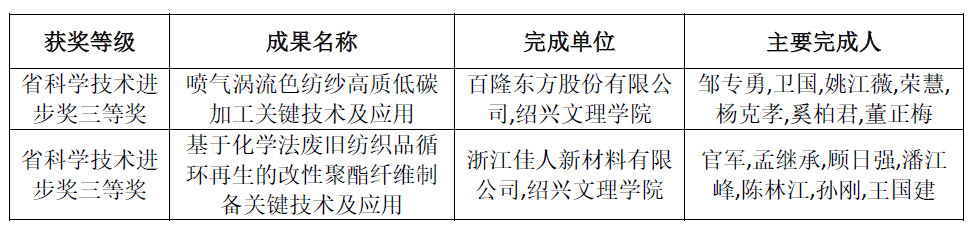 7月11日,浙江省科技创新大会在省人民大会堂隆重举行,大会颁发了306项2021年度浙江省科学技术奖。由纺织服装学院邹专勇教授主持的项目《喷气涡流色纺纱高质低碳加工关键技术及应用》和孟继承教授参与的项目《基于化学法废旧纺织品循环再生的改性聚酯纤维制备关键技术及应用》获省科学技术进步奖三等奖。据悉,科学技术奖是省内科学技术领域最高奖项,也是高等学校、科研院所、高科技企业奋力夺取的“最硬核”奖项。