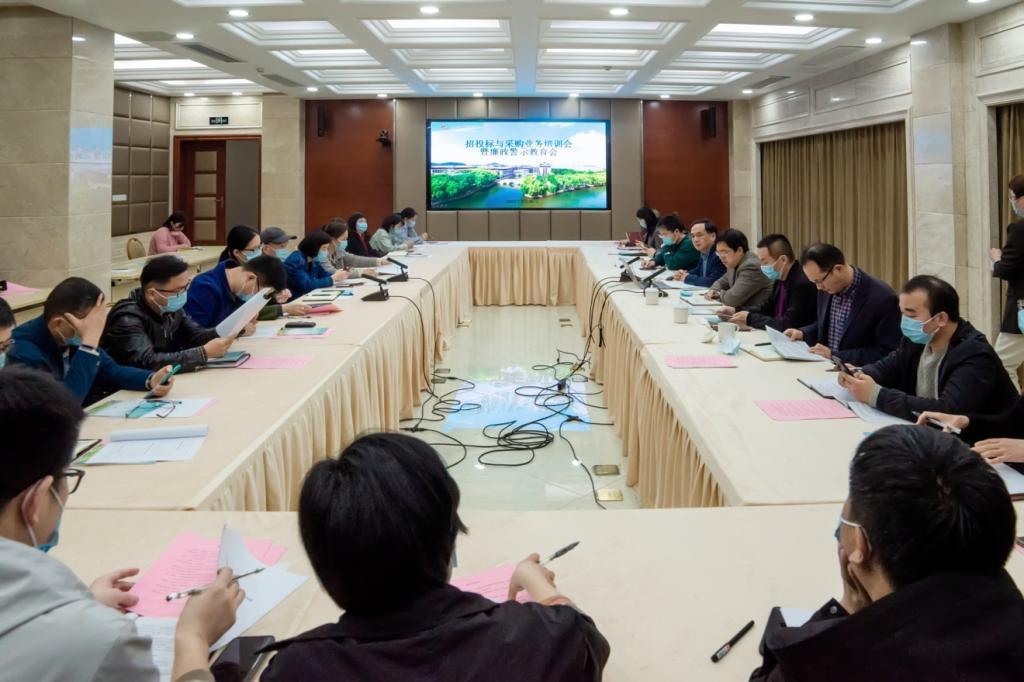为进一步加强学校招投标与采购管理,提升业务能力和水平,加强党风廉政建设,打造“清廉校园”,3月30日下午,学校在铁城科教馆一楼会议室召开招投标与采购业务培训会暨廉政警示教育会。校纪检监察室、资产与实验室管理处、基建处负责人,元培学院、附属医院招标办负责人,各二级学院和部门负责招标采购人员参加会议。会议由招投标与采购中心主任陈剑波主持。