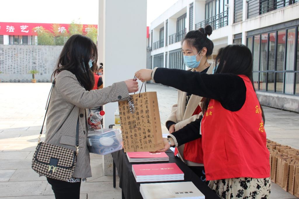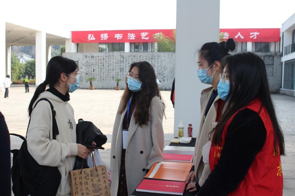 考试结束后,学院在问询处摆放了专任教师的作品册页和师生的作品集,免费发放给考生们。学院老师与考生进行了亲切的交流,考生纷纷表示对兰亭书法艺术学院非常向往。