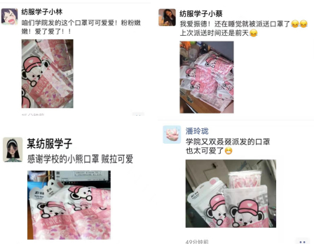 “学院又双叒发爱心口罩啦!这次还是粉粉嫩嫩的樱花粉口罩,真是爱了爱了。”日前,纺织服装学院纺织工程181潘玲珑欣喜得跟同学们分享最新领取的口罩。这不是纺织服装学院第一次为学生发放口罩,自上虞疫情以来,学院连续获得了绍兴振德医疗用品股份有限公司、南京禾素时代抗菌材料科技有限公司、绍兴市杜特纺织品有限公司等3家企业的3万只爱心口罩,目前为止,学院已累计向每一位同学发放了70只口罩。本次口罩好评如潮,同学们纷纷表示,这些“冬日限定”,为在校大家带去一份温暖。