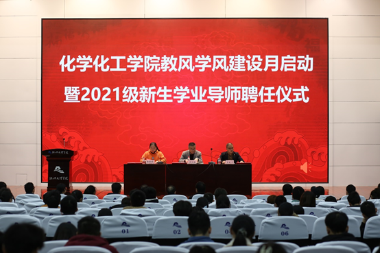11月25日中午,化学化工学院教风学风建设月启动暨2021级新生学业导师聘任仪式在铁城科教馆报告厅举行。学院相关负责人、各班主任、新生学业导师以及2021级全体新生及其他年级学生代表参加会议。