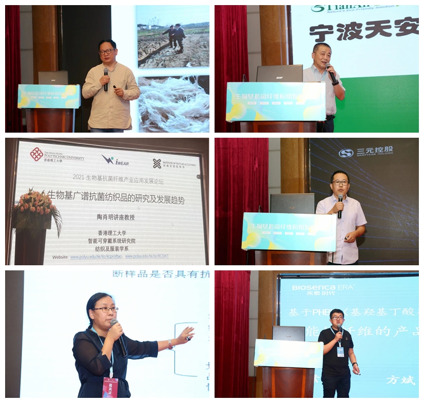 论坛环节采用线上与线下相结合的方式进行,香港理工大学教授陶肖明、TEA·纺智汇创始人潘申洪,宁波禾素纤维有限公司总经理刘辉,杭州新生印染有限公司质量总监展义臻,广东省微生物分析检测中心高级工程师孙廷丽,绍兴禾素时代抗菌材料科技有限公司总经理方斌受邀分别作了题为《生物基抗菌纺织品的研究及发展趋势》《生物基差异化材料赋能品牌价值》《生物基PHBV/PLA纤维生产研发及特点》《抗菌面料的开发与生产经验》《抗菌纺织品标准与测试方法》以及《基于PHBV功能性纤维的产品研发与应用》的专题报告。