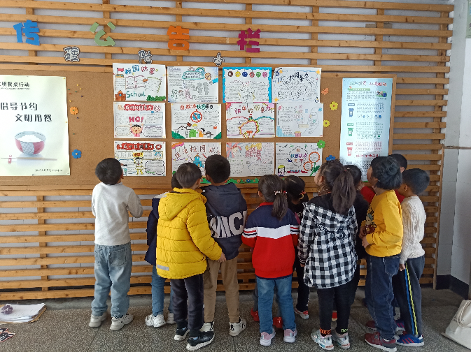 小学生在课间观看 “防范校园欺凌”主题手抄报