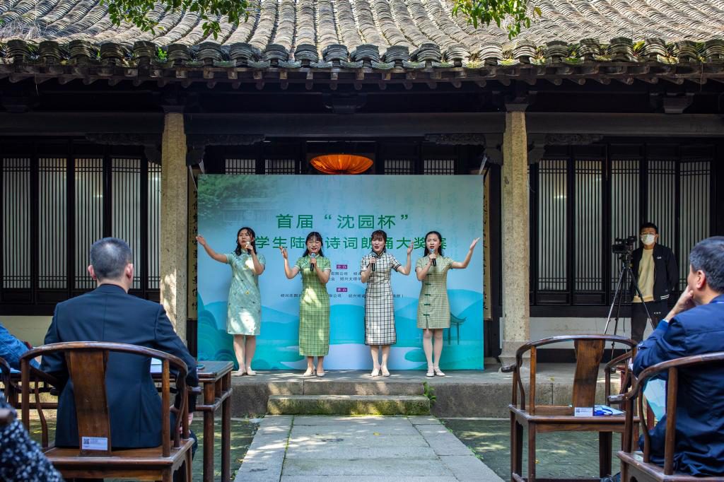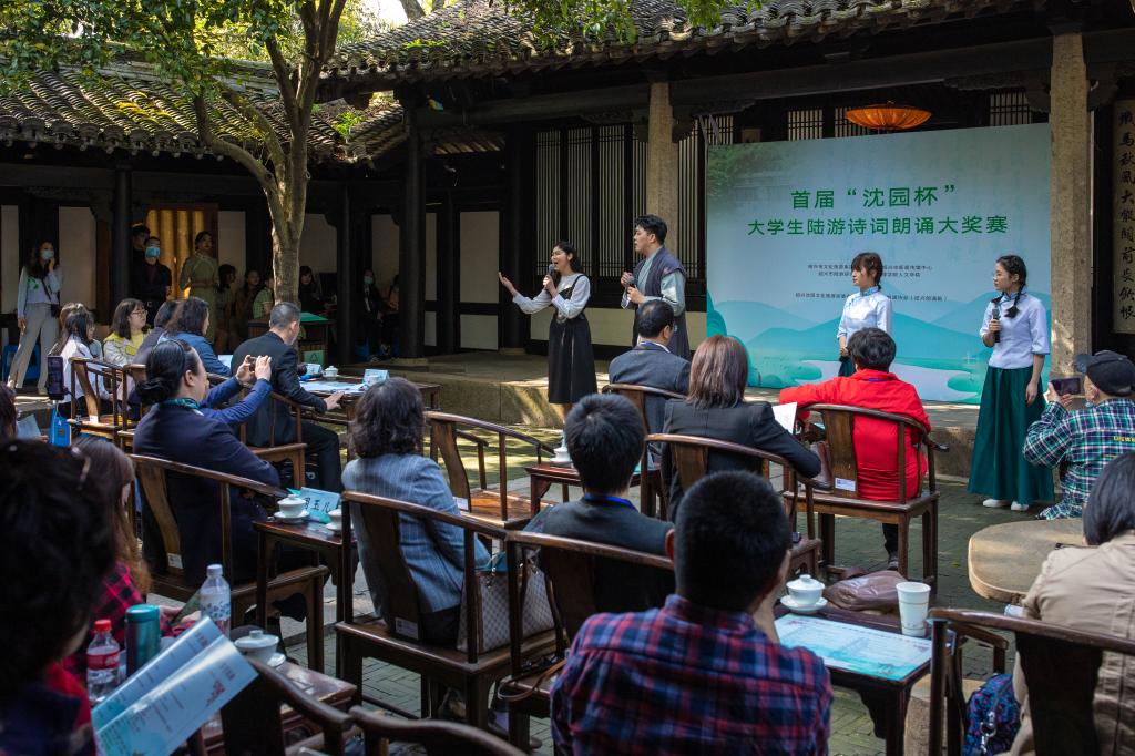 3月28日下午,由我校人文学院联合绍兴市文化旅游集团有限公司、绍兴市新闻传媒中心、绍兴市陆游研究会主办,绍兴沈园文化旅游发展有限公司与绍兴朗诵协会共同承办的首届“沈园杯”大学生陆游诗词朗诵大奖赛在沈园双桂堂举行。