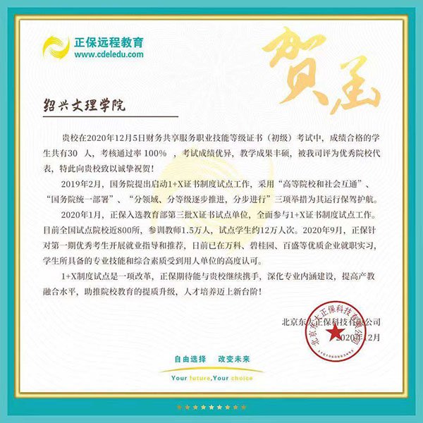 12月5日,上虞分院会计专业学生首次参加“1+X”证书(财务共享服务职业技能等级证书初级)考试。12月7日,经评价组织北京东大正保科技有限公司发布,会计专业首批30名学员考试成绩全部合格,通过率达100%,全国平均通过率为79.18%,通过率居于全国领先水平。