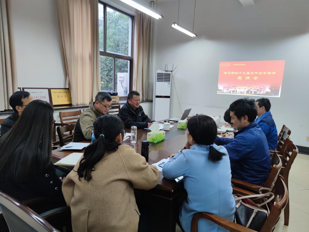 沈赤从背景、内容、意义等方面对党的十九届五中全会精神进行了全面深入解读。他指出,在实现“两个一百年”奋斗目标的历史交汇点上,党的十九届五中全会科学把握国内外面临的复杂变化,研究制定了二〇三五年远景目标的建议,明确提出了第十四个五年规划时期发展的重大方针、重大战略、重大举措,激励动员了全党全国各族人民,具有里程碑的深远意义。沈赤强调,学习好、宣传好党的十九届五中全会精神是当前一项重要政治任务,全院上下要以高度的政治自觉深刻领会全会精神实质,切实把思想和行动统一到习近平总书记重要讲话精神和党中央重大决策部署上来,把学习贯彻全会精神与学院中心工作紧密结合起来,准确把握新形势新任务新要求,勇于担当、奋发有为,以更高站位、更强能力、更好水平抓好贯彻落实,着力推进学院各项事业再谋新发展、再上新台阶。沈赤指出,学院要进一步结合自身的特色和优势,制定好学院发展的“十四五”发展规划,发挥全院师生的凝聚力,促进学院各项工作全面发展。