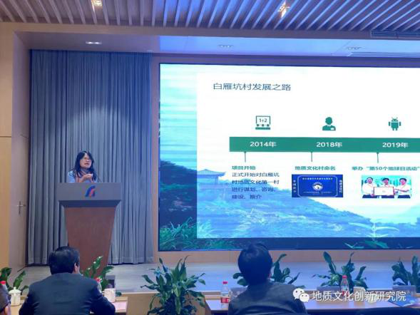 郑丽波教授以“白雁‘榧’来——地质和文化融合发展研究与实践”为主题作了报告。白雁“榧”来是研究院以位于嵊州市的全国首个地质文化村——“白雁坑村”项目为背景,和嵊州市石磺镇人民政府共同创建的一个地质文化村科普平台。白雁“榧”来项目已经在今年的浙江省第三届农信杯大学生乡村振兴比赛中获得金奖。