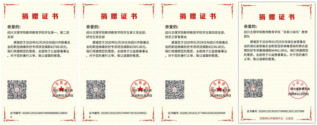 近期,全国多地发生新型冠状病毒疫情。教师教育学院党委全力配合学校相关部门做好各项疫情防范工作,充分发挥党支部战斗堡垒作用。 1月29日,教师教育学院各学生党支部、党员之家、“关爱小候鸟”教育团队通过网络发起募捐倡议,发起倡议半天时间,学院全体学生党员向“绍兴市慈善总会新型冠状病毒防控专项募捐”累计捐款7309元,“关爱小候鸟”学生教育团队向“湖北省慈善总会新型冠状病毒防控专项募捐”捐款6461元。