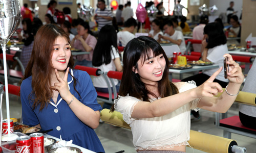 毕业晚会开启前,学院还为2019届毕业生举办了“青春绽放,梦想起航”走红毯仪式。群贤楼餐厅为毕业生准备了温暖而又丰盛的毕业大餐。从白菜木耳炒肉、油焖大虾到水果拼盘,菜色丰富多样,搭配合理得当,赢得在场毕业生的纷纷点赞。据悉,为准备本次毕业晚宴,相关部门提前15天制定食物菜单、完成装饰品采购。无论是播放祝福视频、摆放祝福语还是安排节目、制造生日惊喜等,都包含着学院对即将远行的毕业学子的深切关怀。