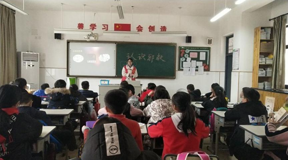 课堂上,我校商学院反邪教协会成员用一段生动形象的反邪教短片,以小学生所特有的生动语言,给孩子们上了一堂特殊的反邪教课。