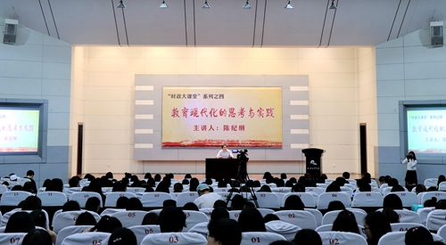 5月7日晚,“时政大课堂”系列之四,浙江省督学绍兴市教育学会会长陈纪钢为现场400余名学生作题为“教育现代化的思考与实践”的专题讲座。