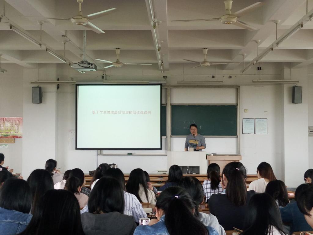 周老师首先以日常阅读中的形象案例解释了阅读的本质,然后结合英语课程标准的相关要求阐述了英语阅读教学的目的及方法。在搭好足够的阅读教学理论支架后,周老师提出了在英语阅读教学中培养学生思维品质的重要性,并详细分析了一篇基于学生思维品质发展的阅读课课例。鲜活阅读课案例的分析帮助英语专业师范生进一步了解如何在英语阅读课教学中关注对学生思维品质的培养。同学们纷纷表示从周老师精彩的讲座中学到了不少开展英语阅读教学的技能技巧,获益甚多。