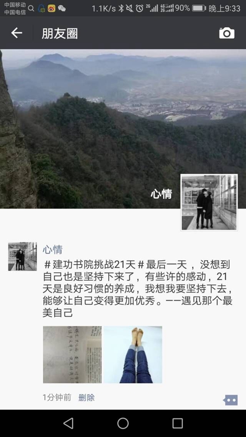 这是一次自我挑战赛,比赛设运动组、阅读组、光盘组、内务组、艺术训练组、早餐组、早睡组、早期组等。为了保障挑战者能顺利完成比赛,每组设有一名组长,挑战者需要每天发朋友圈截图完成打卡,组长会给予监督和鼓励。挑战者发朋友圈一方面是监督自身,另一方面也为身边的朋友传递了正能量。很多同学表示,这样的挑战赛很有意义,虽然比赛已经结束,但是会一直坚持下去。学前141班的闫孜颖在最后一天打卡时说:“习惯了每天早起整理,空余时间看点书,晚饭后约上好友锻炼,希望一切都可以坚持下去”;科教162班的华佳清则说:“没想到自己也是坚持下来了,有些许的感动,21天是良好习惯的养成,我想我要坚持下去,能够让自己变得更加优秀。”数学161班的宋莹然在坚持21天的阅读与练字后感慨:“耐心与睿智并存,奋斗奋斗,同志仍需努力。”
