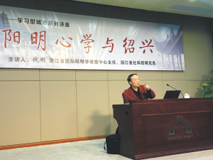 钱明教授深入浅出地剖析了阳明思想与绍兴千丝万缕的联系。他表示,王阳明思想发端于山阴人王思舆,是绍兴这方充满灵气的土地哺育了其新思想;阳明在越地的讲学活动名振四方,出现了成百上千的弟子、道友云集绍兴的盛况,绍兴充满自由的思想氛围和学术环境助益其思想日趋成熟,可以说,绍兴是王阳明思想的发端与成熟之地。他表示,阳明学是绍兴地域文化传承过程中最重要的中间环节,无论是明代文人徐渭、陶望龄、陶奭龄、王思任、陈洪绶、祁彪佳等人的气质,还是现代思想大师鲁迅、蔡元培、竺可桢、经亨颐、马一浮,乃至革命志士秋瑾、陶成章、徐锡麟等人的气质,都与阳明精神血脉关联。阳明的德性学识在绍兴表现得最为突出,也最为集中,从一定意义上说,阳明精神已溶入绍兴人的血液。