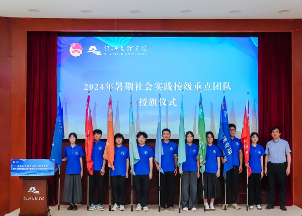 宋浩成向今年暑期社会实践习近平新时代中国特色社会主义思想实践、爱国主义教育、中华文化传承、乡村振兴、基层服务、民族团结、共同富裕、“千万工程”、“美丽浙江”、“浙里青廉”、就业创业、校地联合团建、西部计划等13个主题实践的校级重点团队学生代表授旗。