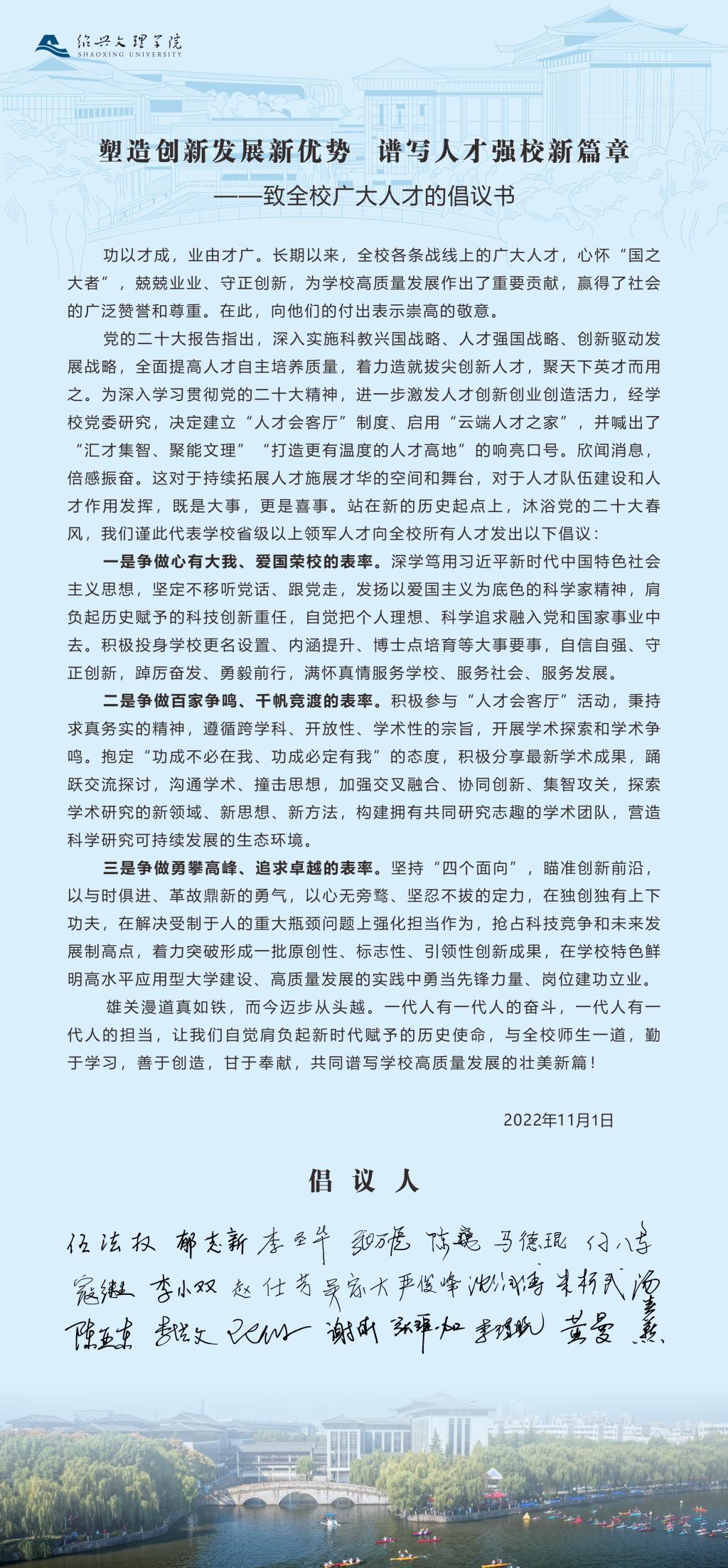 学校省级以上领军人才向全校所有人才发出了《塑造创新发展新优势 谱写人才强校新篇章》倡议书。