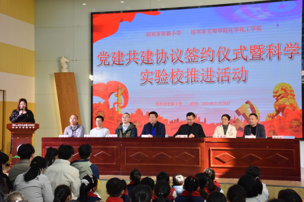 为进一步培养学生的科学综合素养,助力科学教育走深走实,全力推动科学教育高质量发展,11月28日下午,化学化工学院党委与绍兴市培新小学党支部在培新小学体艺馆开展党建共建协议签约暨科学实验校推进活动。绍兴市培新小学党支部书记姚城、副校长阮黎明,化学化工学院党委书记徐青、副院长刘雪松和两校师生代表参加活动。仪式由培新小学党政办主任张明明主持。