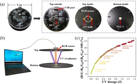 为了实现实时精准的紫外光剂量检测,作者将材料压片并置于商用光电设备中制备了一种紫外光剂量计(图a)。该设备可直接与电脑相连,实时读取光照后材料颜色的RGB参数(图b)。将R/G值的相对增加量与紫外光照射剂量建立相关关系,发现在不同剂量区间中可建立五个线性相关关系,从而实现紫外光剂量的精准检测。该紫外光剂量计携带方便,操作简单,并且读数精确,解决了光致变色材料在光剂量检测领域的应用短板,为新型光检测技术提供了一个具有应用前景的新方案。