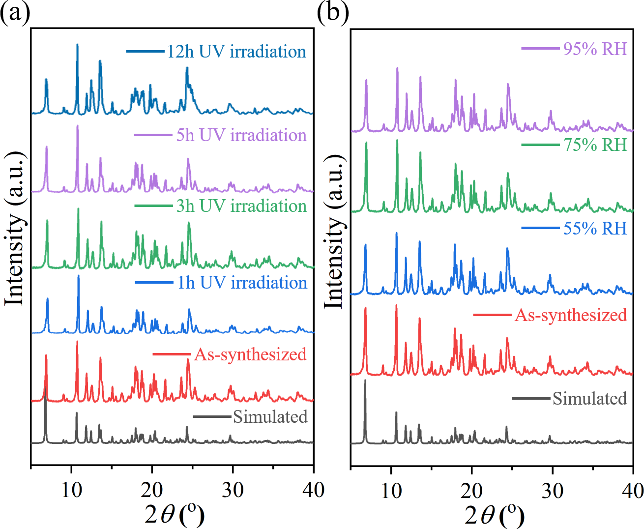 众所周知,结构稳定性决定了材料是否具有应用前景。在该研究工作中,作者利用粉末X射线衍射技术(PXRD)验证了在光照和加湿条件下材料的结构稳定性。如图a和b所示,紫外光照射12小时或湿度95 %条件下,材料的PXRD图谱未见明显的峰位移动和峰强减弱,说明其具备优异的光照稳定性和抗湿度稳定性。因此,该材料具有潜在的实际应用价值。