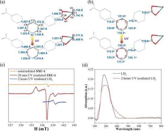 为了深入研究材料的光致变色机理,作者对光照前后SXU-1的单晶结构进行解析。如图a和b所示,光照后SXU-1的局域结构发生了明显的变化:1、有机配体吡啶环中的键长和键角发生变化;2、有机配体羧基中的C-O键长发生变化;3、铀酰离子中U=O键长整体缩短。为了探究材料结构变化的机理,作者还采集了光照前后材料和配体的EPR光谱和UV-vis光谱(图c,d)。研究发现,光照诱导材料产生了氧自由基和氮自由基。由此可见,该材料在光照过程中产生了光生自由基,微观上影响了材料的局域结构,宏观上导致了材料的颜色产生明显变化。