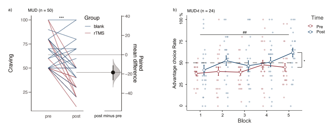 为了明确重复经颅磁刺激的干预效果,作者比较分析了MUD组干预前后线索诱导渴求度的变化。结果发现,治疗组(MUD-t)干预后的渴求显著减少,但MUD空白组(MUD-n)没有发生变化。对干预前后IGT中优势选择率的分析结果发现,在rTMS治疗后,MUD-t组在爱荷华赌博任务中有更有利的选择,有利牌组选择的比例增加。这表明rTMS干预MUD患者的左侧dlPFC在减少渴求评分、提高决策能力方面表现出有效性。